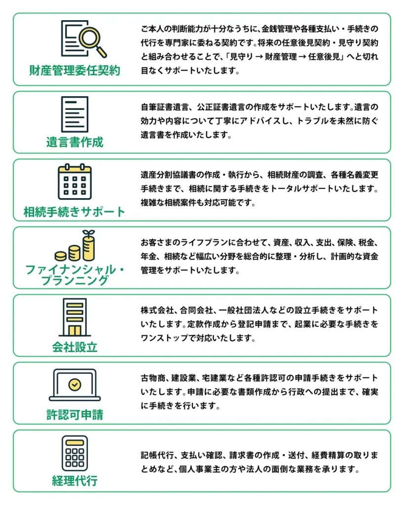 このたび行政書士法人を設立することで、これまで外部の専門家と連携して対応してきた「財産管理委任契約」「相続手続き」「遺言書作成」を、グループ内で直接ご提供できる体制を整えました。